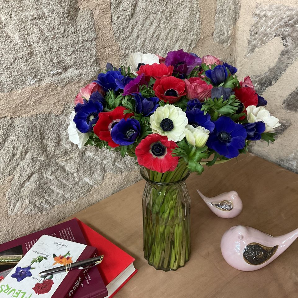 Ce bouquet est composé de 40 tiges d’anémones multicolores de 50 cm.
