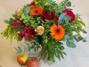 Bouquet rond aux teintes chaudes, composé d’au moins 50% de fleurs et feuillages cultivés en France