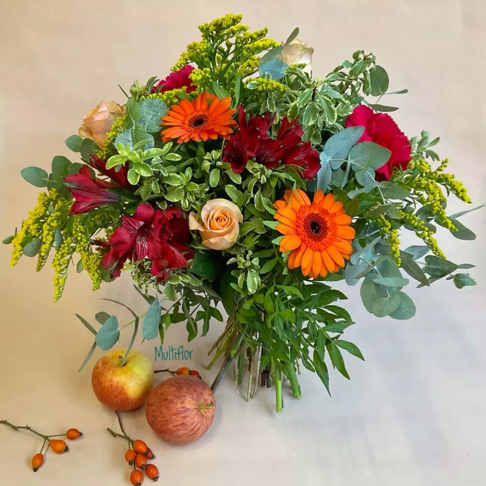 Bouquet rond aux teintes chaudes, composé d’au moins 50% de fleurs et feuillages cultivés en France