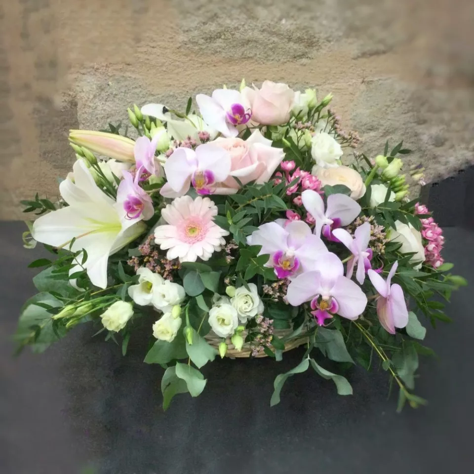 Elle est composée de roses, lys orchidées et autres fleurs fraîches blanches et roses.
